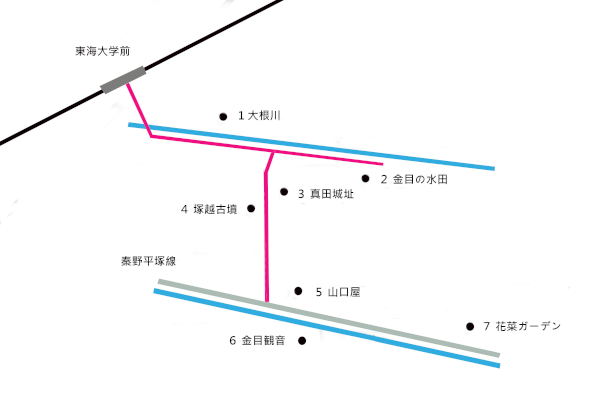 最寄り駅は小田急線の「東海大学前駅」、ここからおおむね徒歩で5kmほど歩いて花菜ガーデンをゴールにしたいと思います。