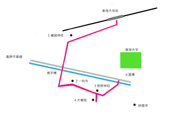 最寄り駅は小田急線の「東海大学前駅」で、ここを起点におおむね一周4kmほどを歩くことになります。