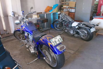 店舗は細長く奥につながっていて、30m以上先に裏口がある。その裏口にはクラッシックなバイクが3台。