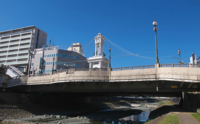 「まほろば大橋」の上の時計塔は街の今のシンボル。