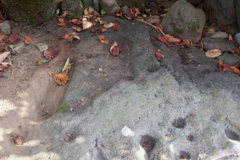 この石は「五郎の沓石」と呼ばれ、曽我五郎が足を患った際、自分の体力が衰えていないかと心配になって、試しにこの石の上で踏ん張ったとされる石です。伝承には