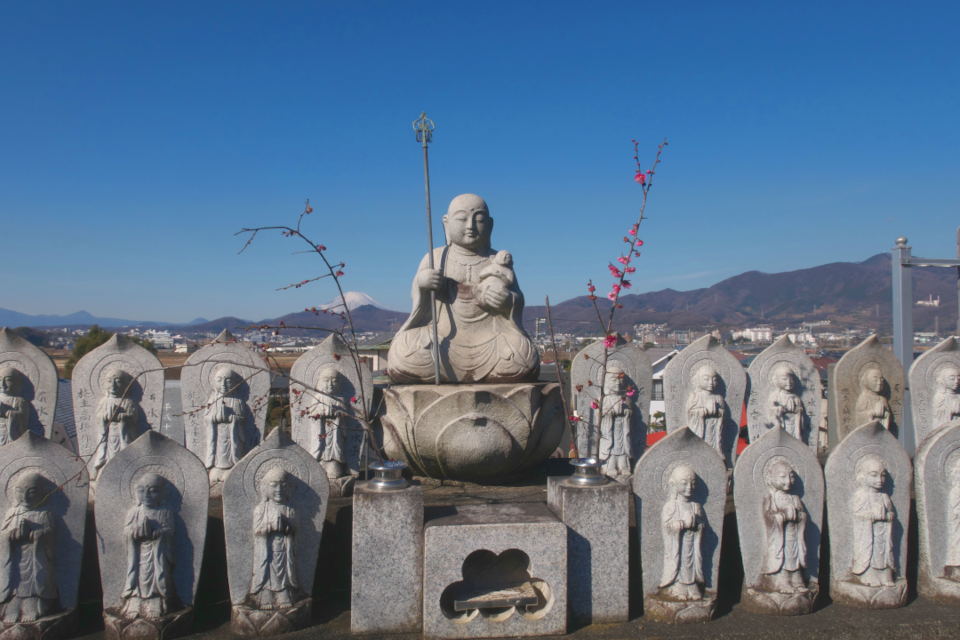 石仏がたくさん並んでいる画像は大光院というお寺です。こちらのお寺は水田を見下ろす高台にあって、99体の石仏の彼方に富士山が見えるという、なかなかの絶景ポイント。