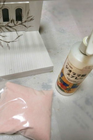 あとはうっすらとデッキ部分に糊スプレーを吹き付けてから桜パウダーをまきます。そして次に壁とデッキの接するラインにのみ、更に桜パウダーを追加します。