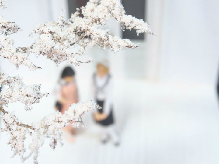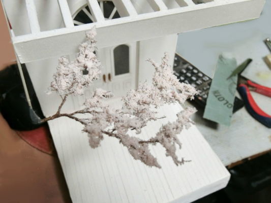 今回絶対にやりたかったのは桜の表現です。太さの違うワイヤーをより合わせて枝をつくり、鉄道模型用の桜パウダーで花を再現してみました。
