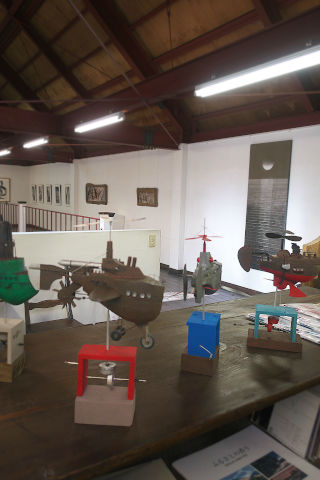 左はヒットシリーズの「空飛ぶ潜水艦」です。ほとんどが紙でつくられているんだけど、この金属の質感の出し方がすごい。多忙故にご本人は不在でしたが、今度会った時に