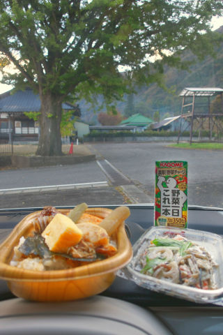 ご近所のスーパーで買ったお弁当を電子レンジで温め、保温袋に入れて持ってきました。ついでにコンビニでコーヒーを追加する。大したメニューでなくても、こういうところで食べれば