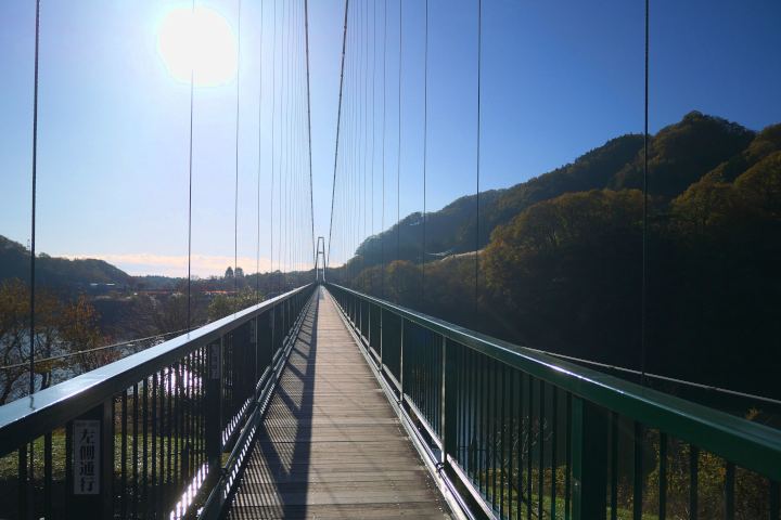 最初にやってきたのは那須塩原温泉の入口にある「もみじ谷大吊橋」です。こちらは箒川を堰き止めてつくったダム湖にかかる全長320mの吊り橋で、名前の通り秋の紅葉の時期は特に人気のあるスポットです。