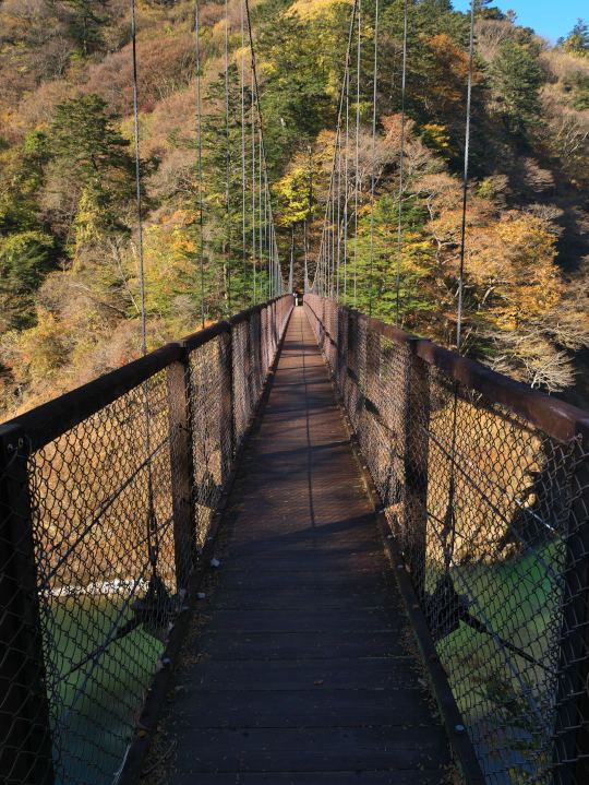 少々のスリルと素晴らしい景観。でも今年は夏の暑さで葉を落としてしまった樹が多いようで、色合いの鮮やかさは例年に劣る感じです。