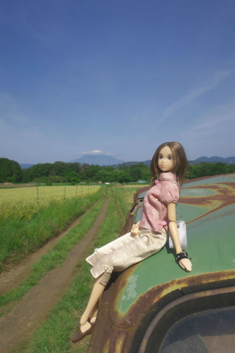 麦畑と富士山、放置されたワンボックスが画になっている。