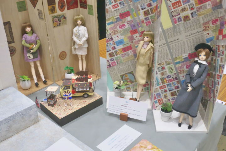 持って行ったのは個展で展示する予定の3点のジオラマと、販売する4点の背景つきドールです。まわりに比べるといたってシンプルで地味な感じだな。
