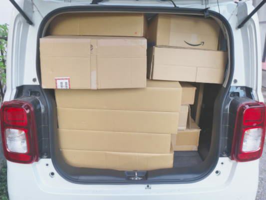 トラブルがないよう、手順をを考えながらリビングの一角に120cm×114cm×90cmの範囲内で積み上げる。このサイズは軽自動車の荷室のサイズそのものです。