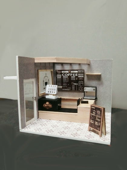 背景として使うのは、こちらのコーヒーショップです。1/24スケールの小さなドールハウスキットです。確かAliexpressで2000円ぐらいだったと思う。まだよく確認
