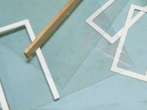 しなくてはいけません。キットに付属していたカバー用の透明プラバンを加工して壁を作ります。木材や板目紙などで枠やドアを追加してシースルーなものにします。