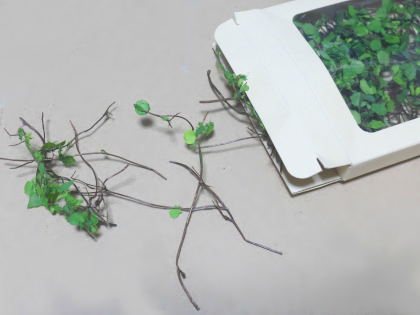 さっそくパッケージから取り出してほぐしてみると、もうすぐにボロボロと葉っぱが落ちてしまう。