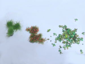植物はストックしておいた造花や鉄道模型用のパウダー類、ジオラマ素材などから作り上げています。