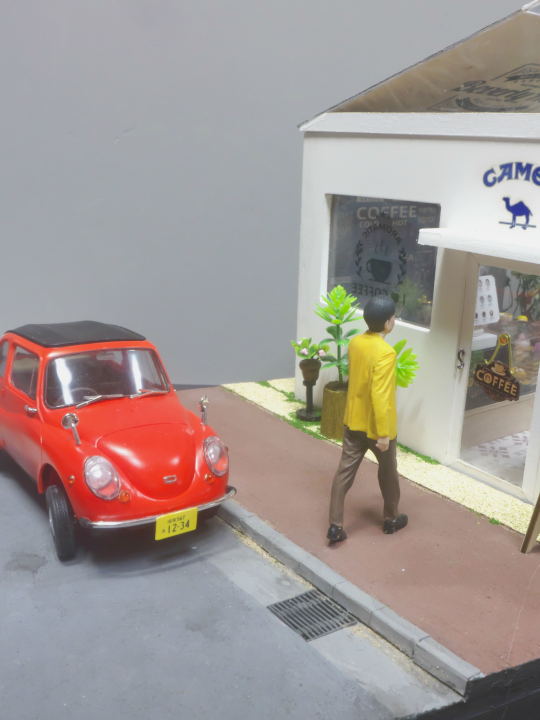 道に駐車したスバル360は今でもファンのいる名車です。こちらはハセガワのキットをストレートに組んでいます。