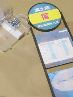 先ほどのバス停も写真に撮って、グラフィックアプリ(GIMP)で加工してプリントアウト、それを板目紙に貼り付けます。