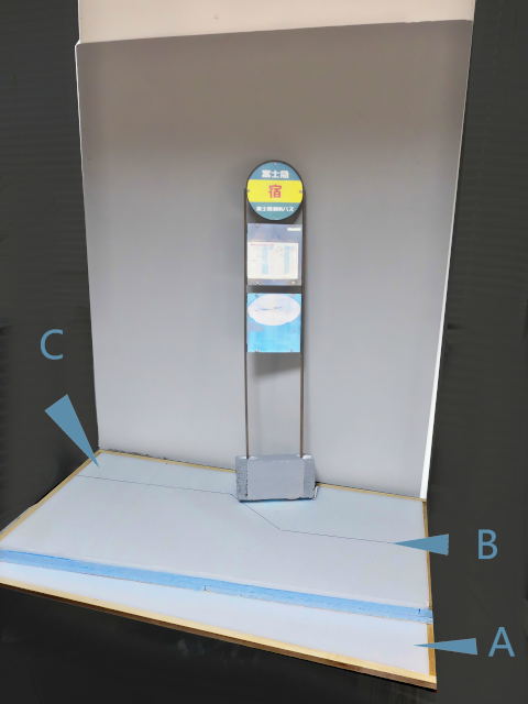 Aは道路、Bは歩道に仕上げる予定です。バス停の背後は最初の画像だと草地になっているけど、このCの部分には石仏や道祖神を置く予定です。