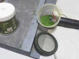 葉の細長い草はジオラマ素材の長さ5mmから1cmのファイバーを混ぜたもので表現するのですが、これはまず、KATOの草原のりを塗り、スタティックアプリケーターで静電気を