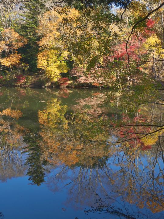 この湖の特徴は周囲を丘陵に囲まれた窪地にあるので、風が吹くことはあまりない。だからいつ来ても水面が鏡のように景色を映す。上下対象の紅葉が楽しめます。