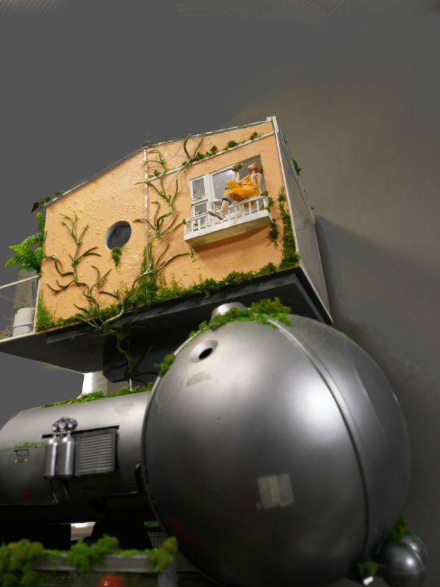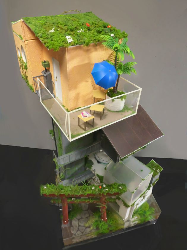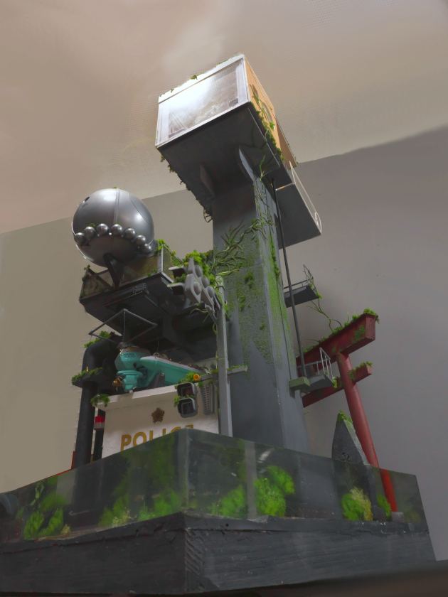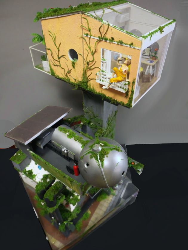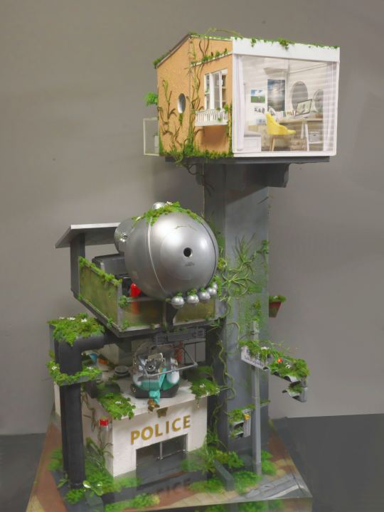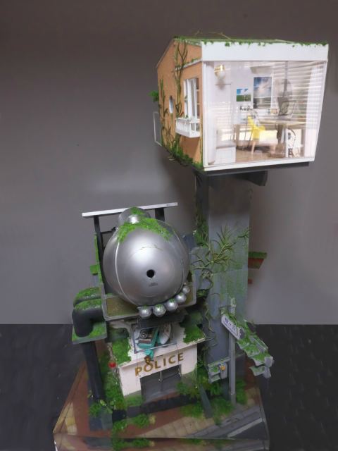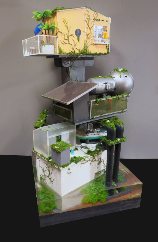 こちらは水没してしまった街を1/24スケールのジオラマでつくっています。温暖化がすすんで海水面が上昇してしまった近未来をイメージしています。
