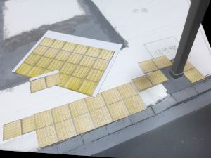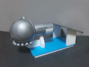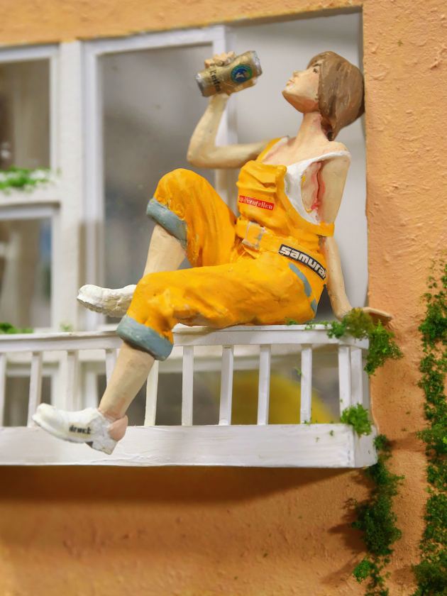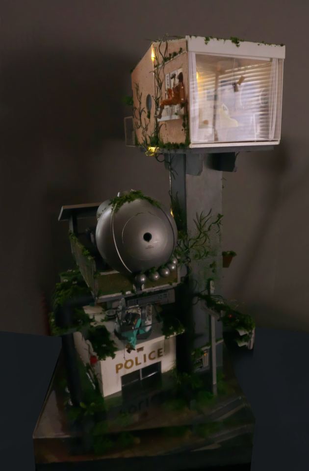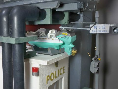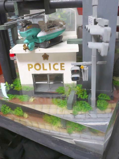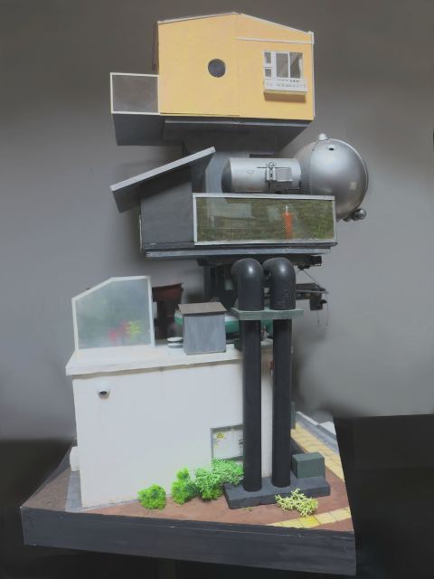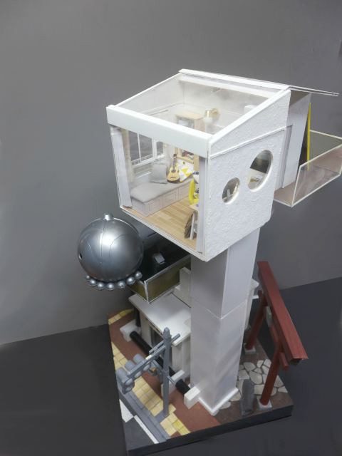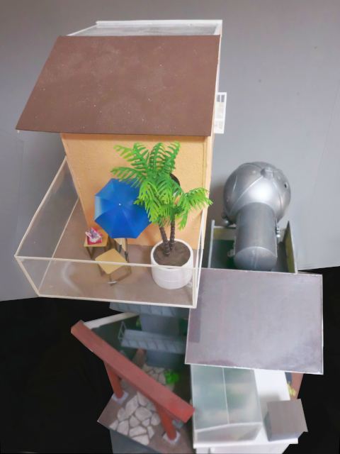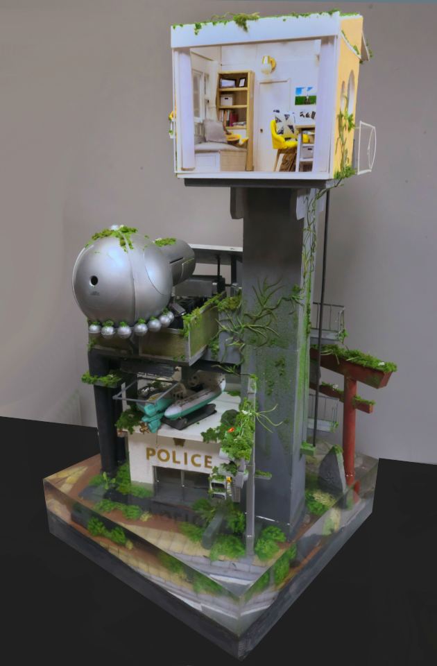 こちらは水没してしまった街を1/24スケールのジオラマでつくっています。温暖化がすすんで海水面が上昇してしまった近未来をイメージしています。