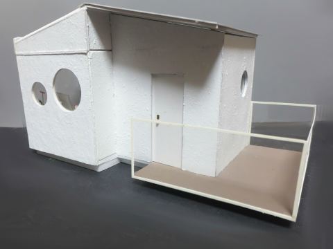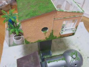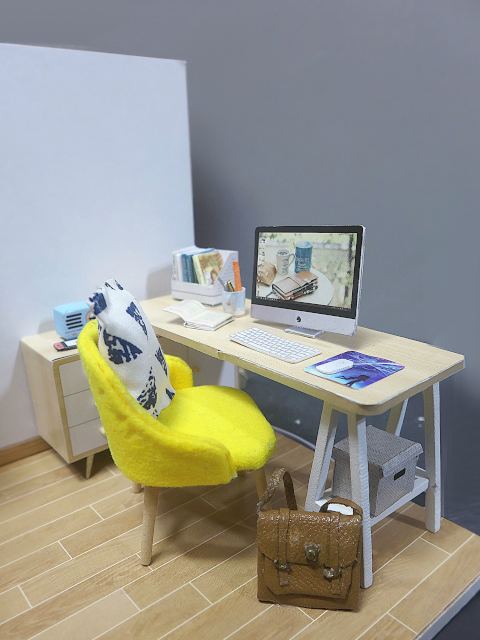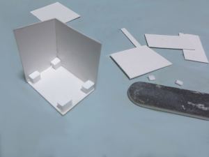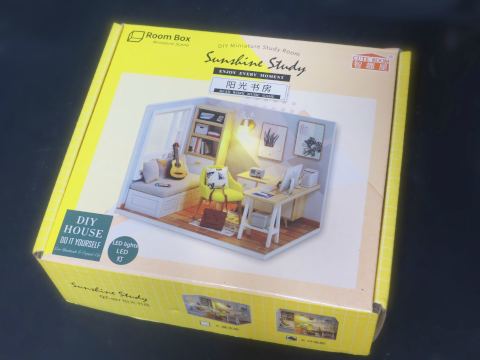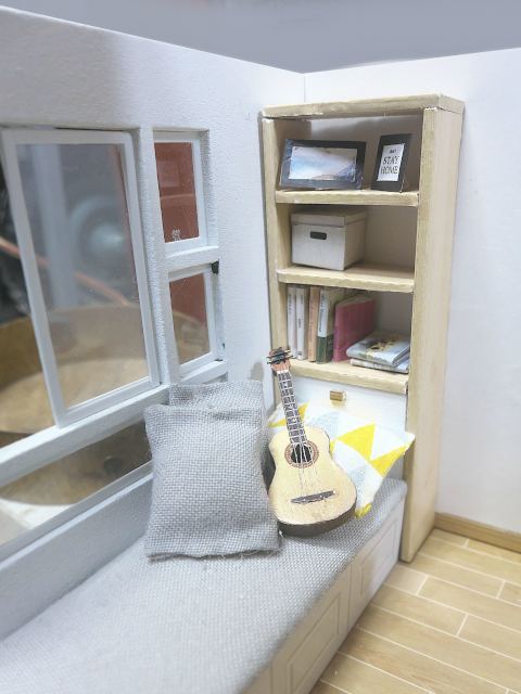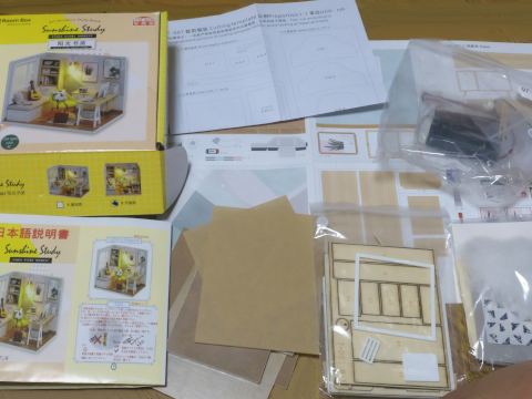 このキットは一辺が10cm程度の直方体で、床と奥の壁、左の壁の3面だけが表現されていて、他の3面は素通しです。これでは落ち着かないので、机の前は丸窓付きの
