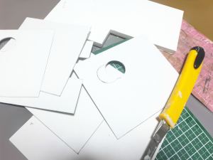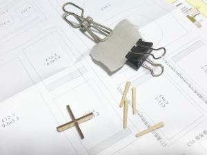 画像中はギターとラジオ、木製パーツの上に模様の印刷された紙を張り付けてつくってゆくのですが、ここできれいに作るには少しコツがある。