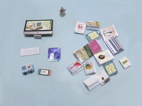 ペン立て、PC、ラジオ、ゲーム機、あとは本が14冊。