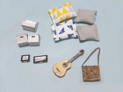 ブックスタンド、整理箱2、フォトスタンド、クッション4、それにギターとバッグ。