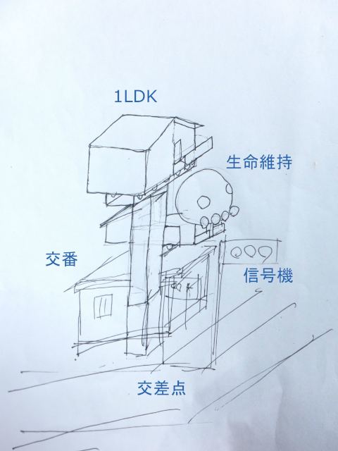 もはや交番はこの家の土台でしかない。あわせてソーラパネルや水の浄化装置といった生命維持機能持ったプラント部分が大きな存在感を持つようになる。