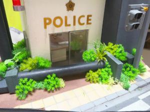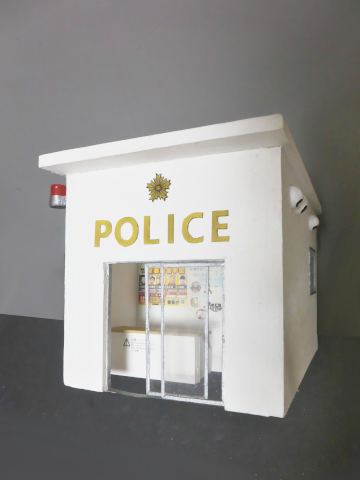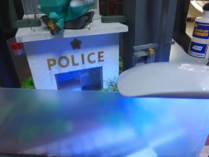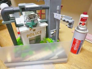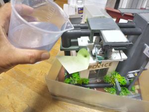 交番の入口は透明なプラバンで仕切られているので、あらかじめ天井に穴を開けてそこからレジンを流し込む、それが終わったら外側、そんな感じで流し込みが始まりました。
