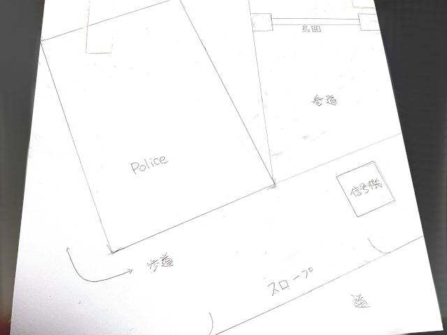少し難しいことなのですが、最初まずはここに神社があり、次は交番がそれを遮るように建てられ、水没し、再び家が建てられ、次第に緑に覆われて、そういったポイントになる