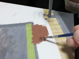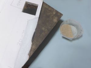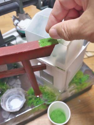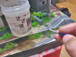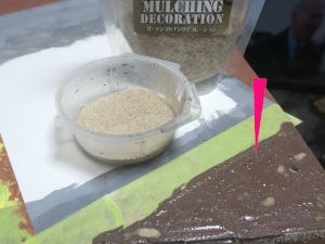 まずはジオラマパウダーとターフを3種類混ぜて、水で薄めた木工ボンドを塗ったところに撒く。