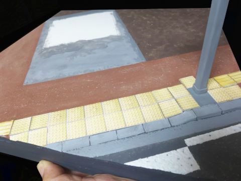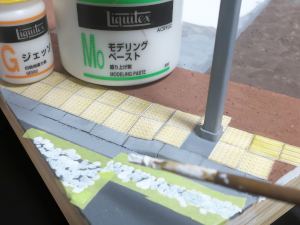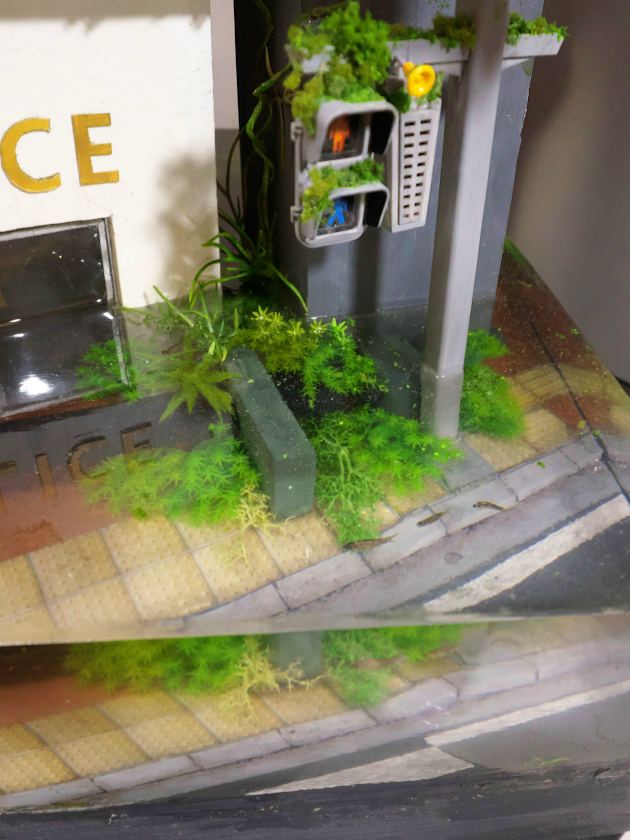 地面部分も時間経過に沿ってつくっています。まずは土の地面をつくり、歩道やアスファルトを表現し、レジンを流し込んで水を表現する。そしてその過程の適当な段階で植物と魚の表現をする。