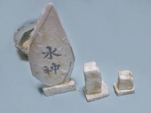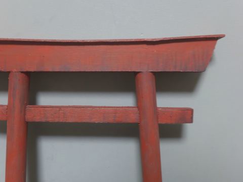 鳥居の向こうに見える白い建物は植物を育てるハウスです。その他作品には釣りの道具なども置かれていて、基本ここだけで生活できるという設定で作品を制作しています。