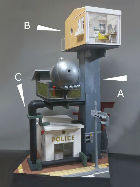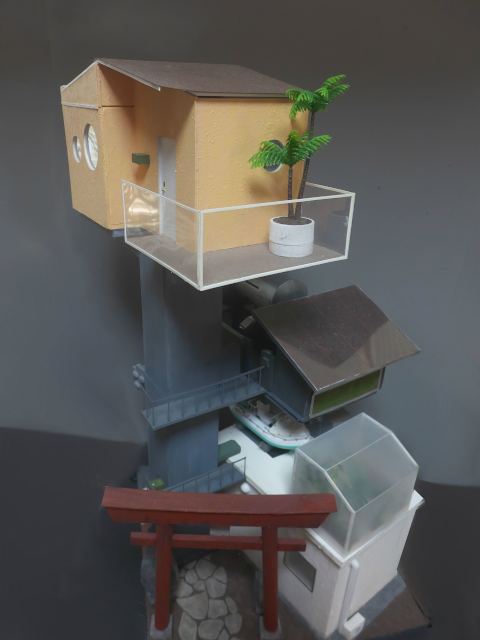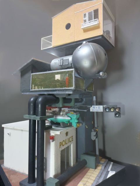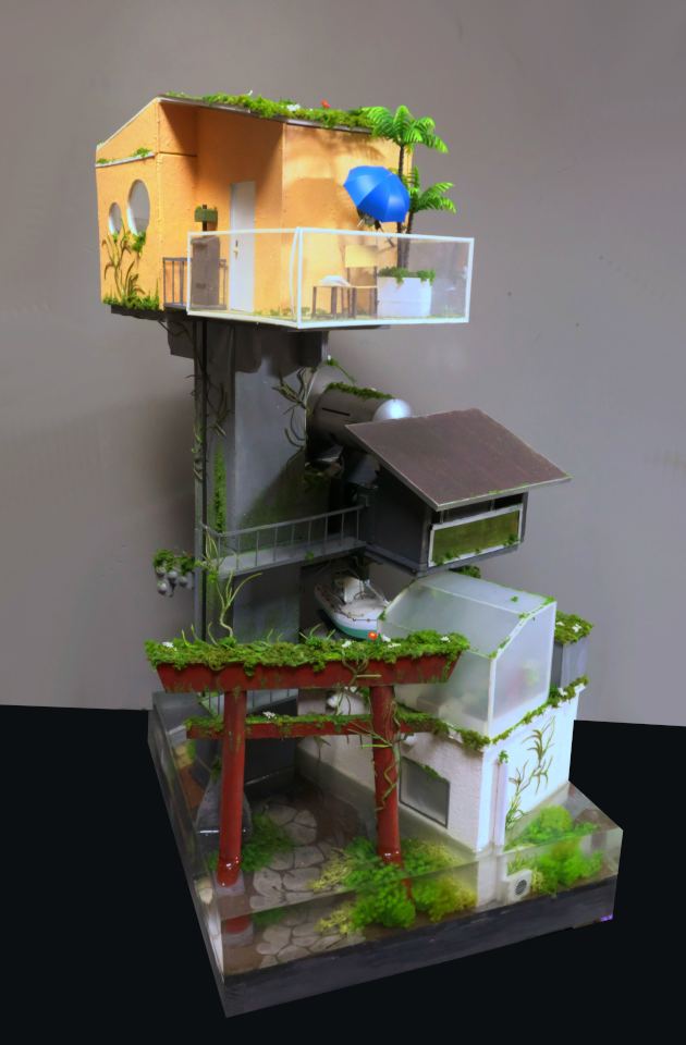 基本的には3層構造になっていて、一番下は水没してしまった現代の風景で交番とs神社の入口を再現しています。最上部が居住区、そして中央部分がソーラパネルや