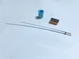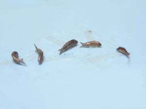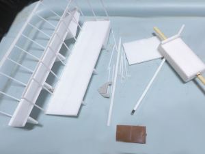 材料は尾びれが0.3㎜厚のプラバン、その他のひれは省略、胴体はエポキシパテ、つなぎ目は瞬間接着パテで埋めます。体長1.5cmのものを5匹作る。