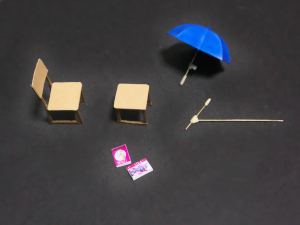 まず作っているのは椅子、加工された木製のパーツを組み合わせてボンドで固定し、上に綿を含んだ布を被せてゆきます。(画像左)