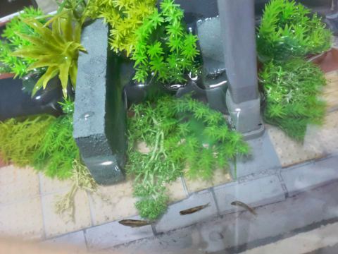 水没すれば植生も変わる。汽水域という前提でそれらしいビニル製の観葉植物を中心に植えてみました。もちろん魚も泳がせる。こういうところに怠りが合ってはいけない。