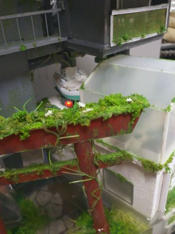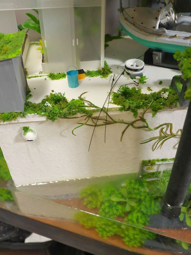 最初のうち、植物表現は水中の水草だけで良いと考えていましたが、放置されたところは例外なく植物に覆われてゆく。時間がある程度経過すれば地衣類だけでなく、それを寝床にして
