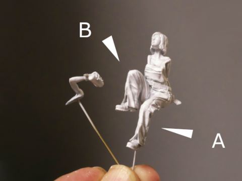 イメージに合わない部分は修正を加えます。ジオラマは高温多湿のイメージなので履いているつなぎは膝丈にする(A)。膝の形状やしわが気になるので修正(B)。