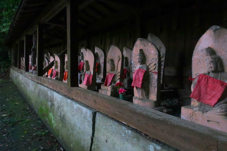 本堂の前にはたくさんの千羽鶴などが奉納され、人々の信仰が厚いことを物語っています。この日も早朝に関わらず、何人もの人が訪れていた。そして本堂の右手に見る石仏の