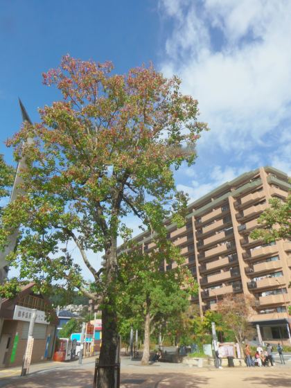 小田急線の「鶴巻温泉駅」前です。この通りのナンキンハゼはとってもきれい。奥に見えるのは以前ジオラマにした「白髭食堂」です。