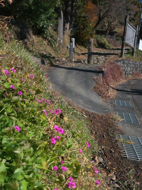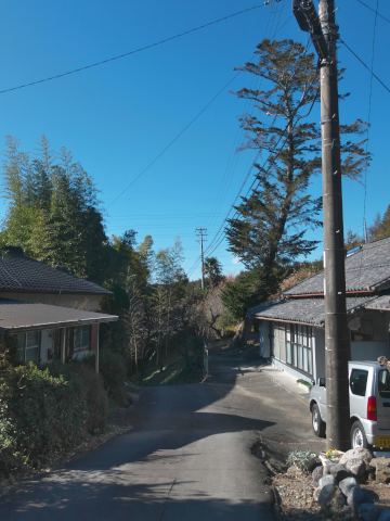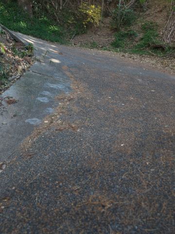 これが実際の道で、「上る」というよりは「登る」と言った方が相応しい感じの道です。幅は3mあるかないか、今でこそ舗装はされているけど、葉っぱが少しでも積もっていたら