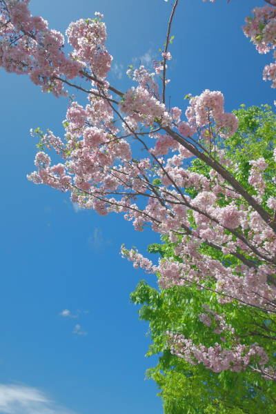 桜の写真というと、桜のピンク+菜の花の黄色+青い空という組み合わせが代表的だけど、咲くのが少し遅い新緑の時期なので、こんな感じでピンク+新緑+青の