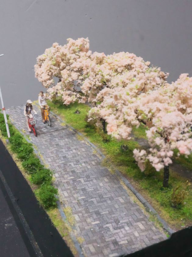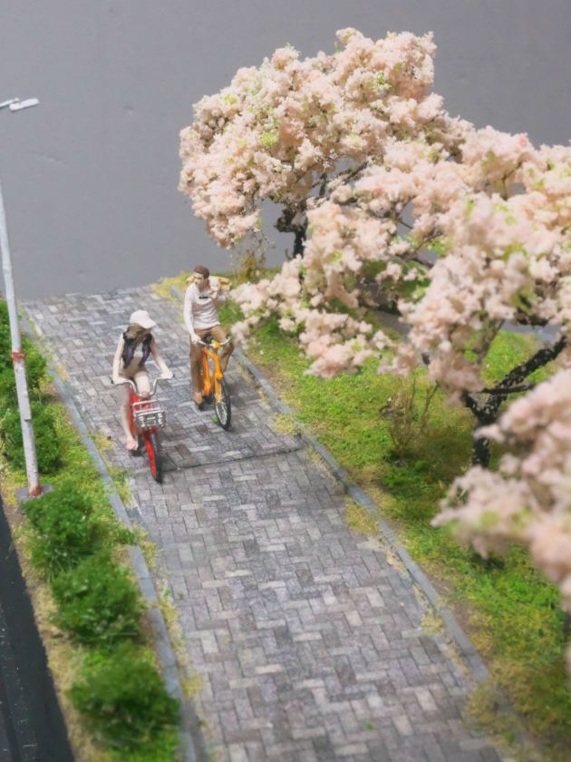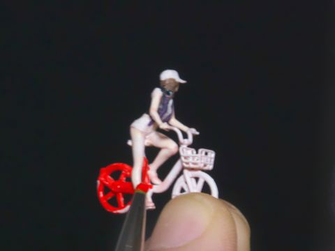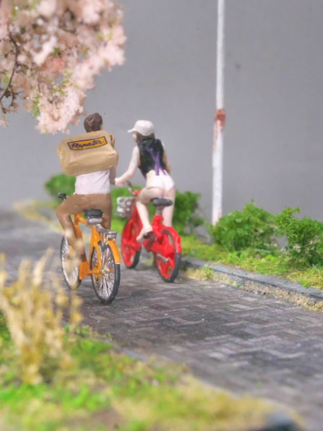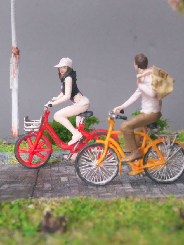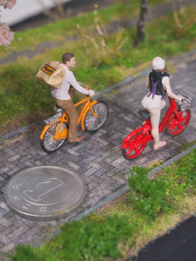 実はこの情景のスケールは1/64、ジオラマサイズは25cm×20cm、大きく見えるかも知りませんが、2台の自転車がこの1円玉の上にのります。自転車のスポーク