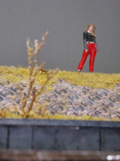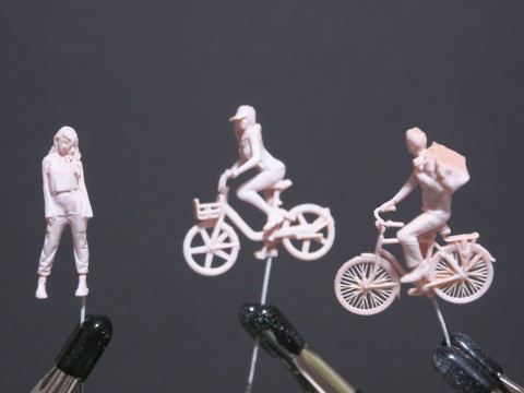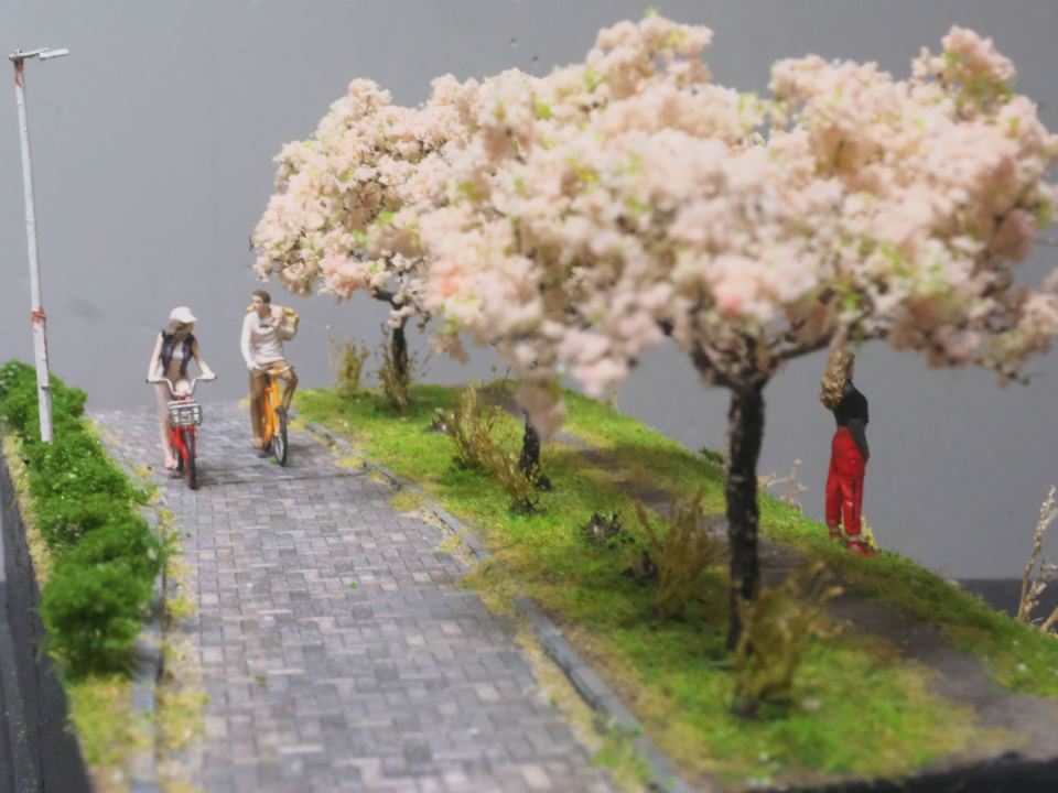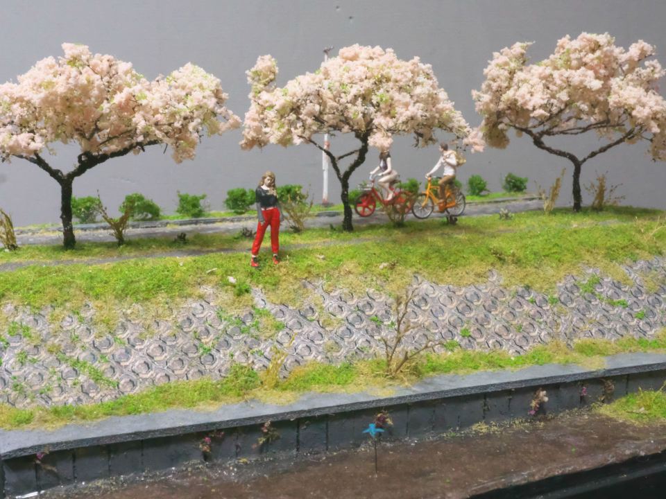 3Dプリンターによって造形された1/64スケールのフィギュアを使って、ご近所の河原の風景をジオラマにします。