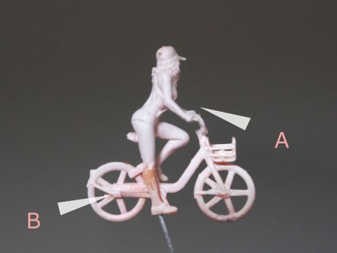 自転車のフィギュアにはもう少し手を加えました。ボディから浮いているサスペンダーが途中で欠損していたので、紙でこれを補う。(A) そしてものすごく短いショート
