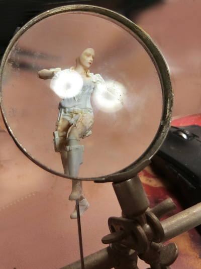 上の画像は、身長2.5cmのフィギュアの足の間にある、直径1mmほどのフレームを赤く塗っているところです。塗ることのできる角度を選んで筆を入れてゆく作業は至難の業、